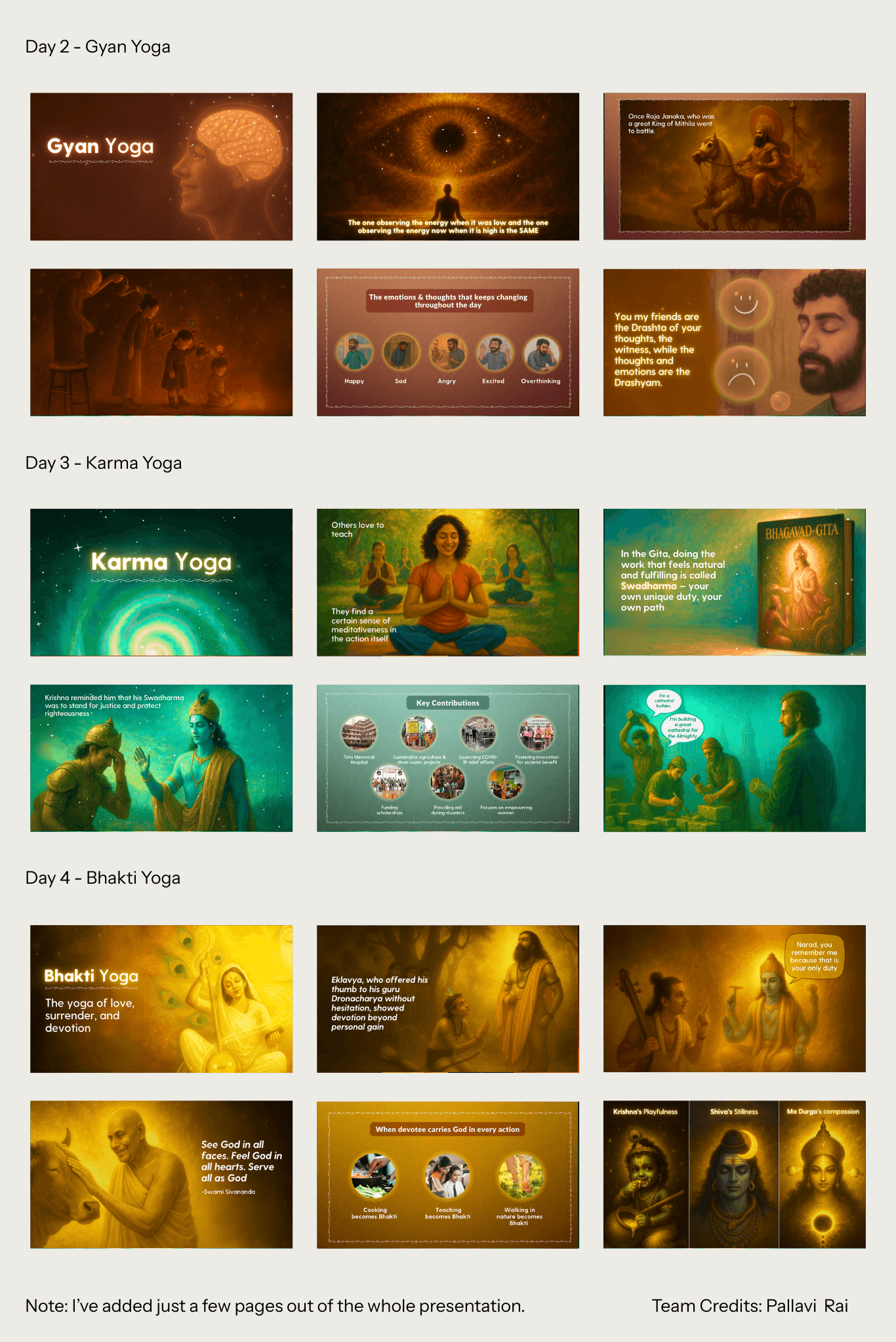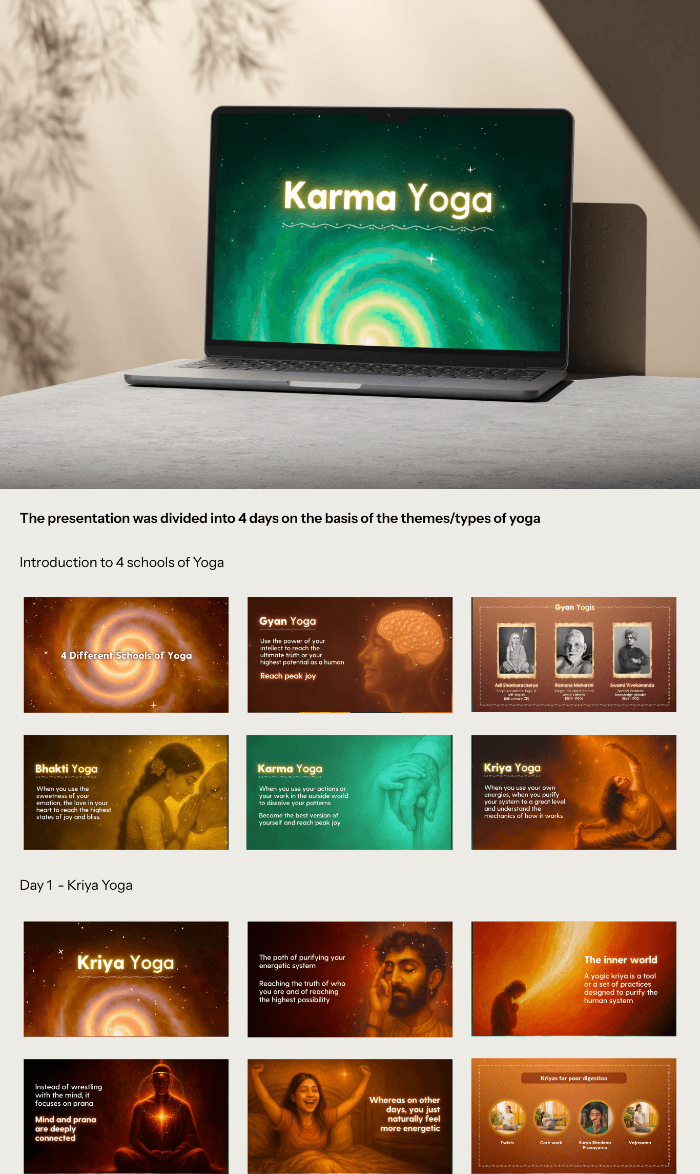 Each presentation needed to align closely with the workshop’s theme, spiritual depth, and brand language, while remaining visually engaging and easy to follow during live instruction. The decks supported teachings across yoga asanas, kriyas, meditation, philosophy, and lifestyle practices, helping participants grasp complex ideas through visual storytelling rather than written explanation alone.