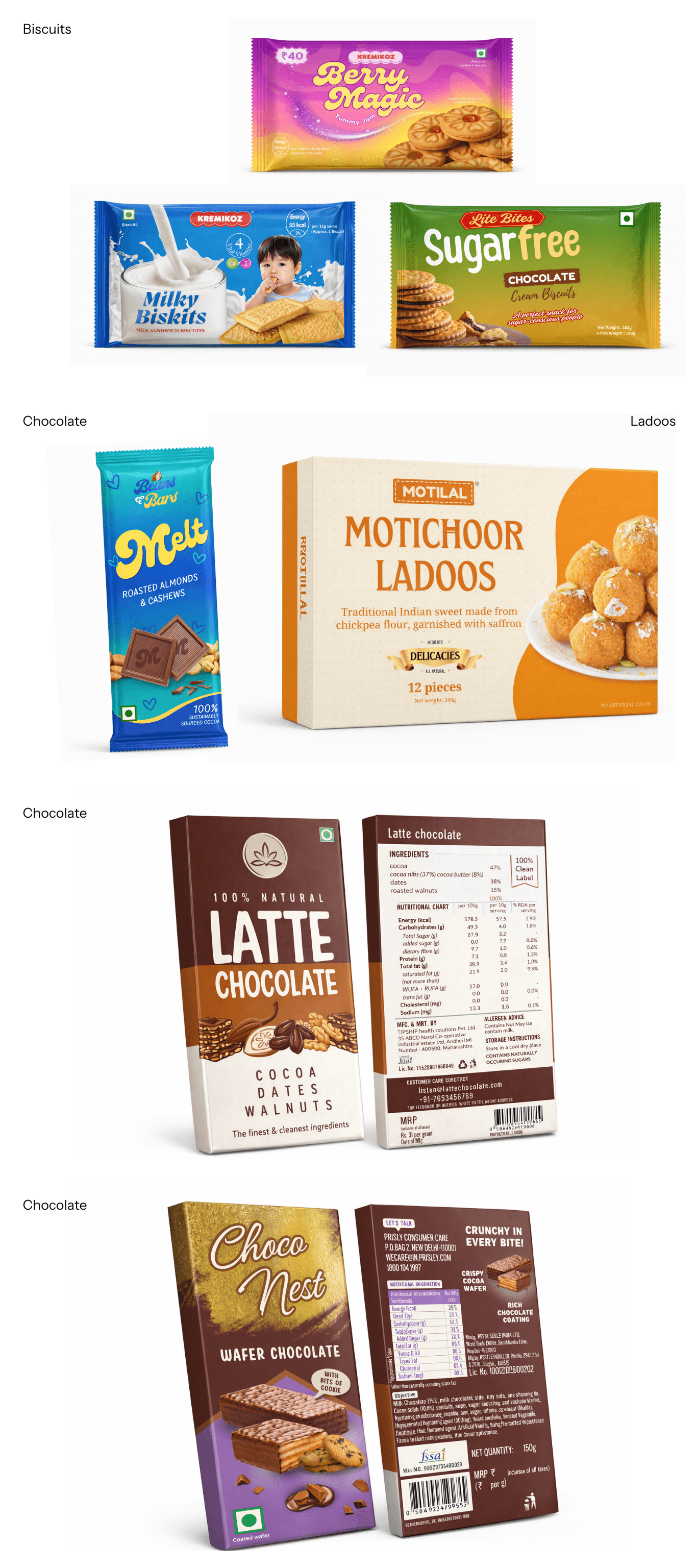 The project covered a wide range of food categories, including biscuits, namkeens, chocolates, soft drinks, nuts, energy bars, ladoos, and more, making the learning relatable and grounded in everyday consumption habits.