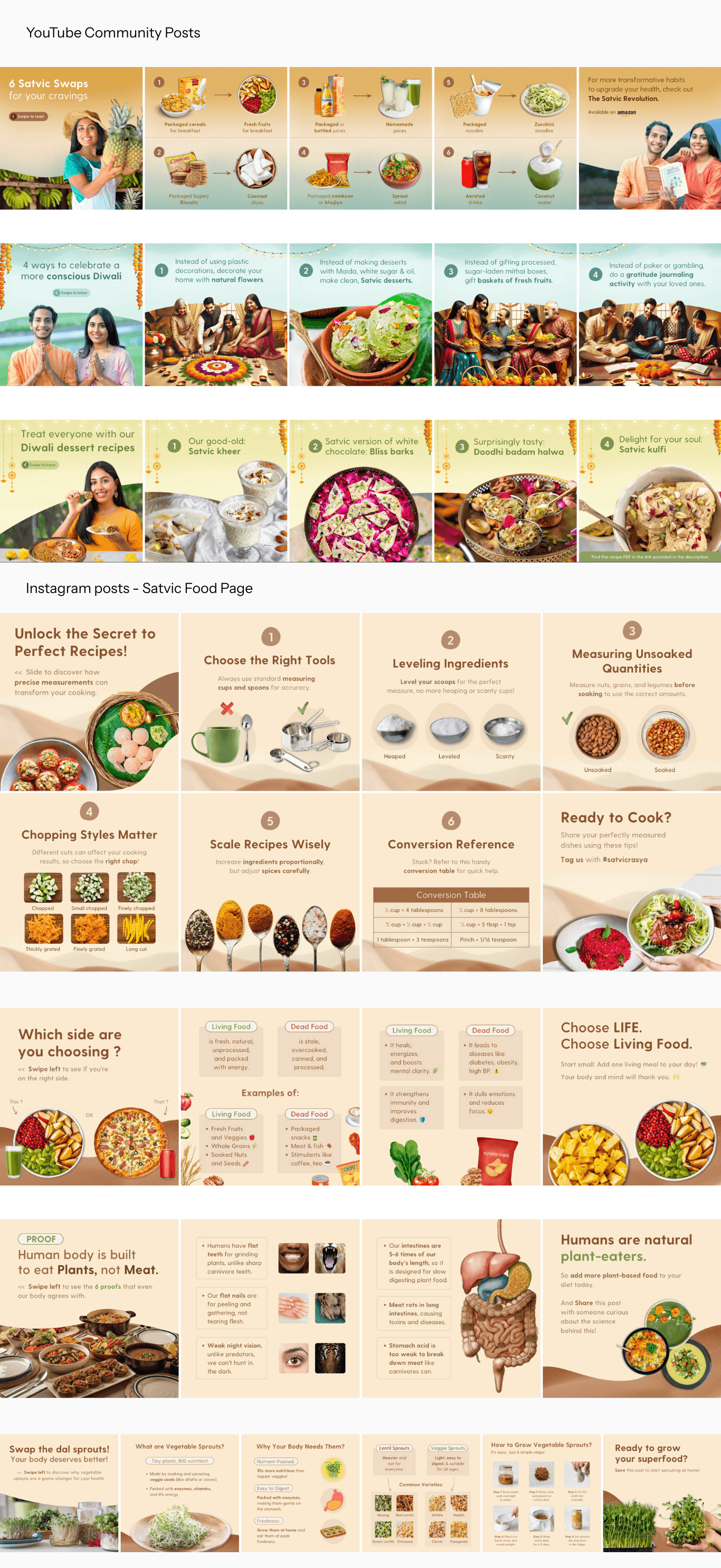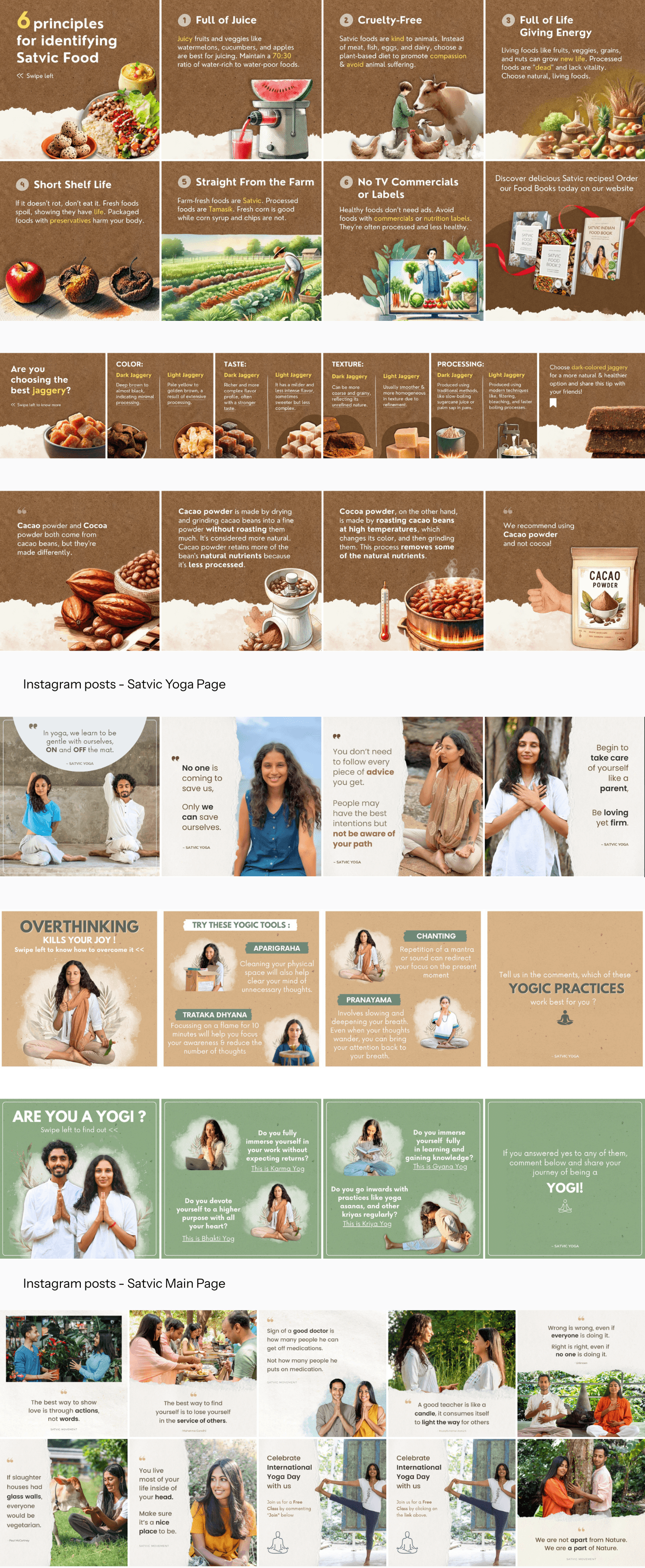 This project involved designing social media creatives for multiple platforms and brand verticals under Satvic Movement, including their main Instagram page, Satvic Yoga, Satvic Food, and YouTube community posts.